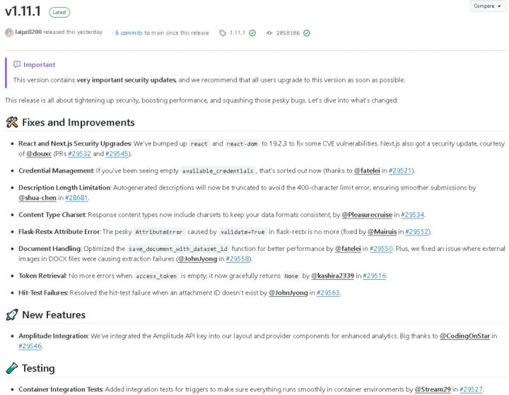 2025年12月12日,dify 发布了 1.11.1 版块。此次更新包含了相配贫瘠的安全补丁、性能擢升以及些许 Bug 蛊惑,官方历害提议所灵验户尽快升级到该版块,以保险系统的安全与褂讪。